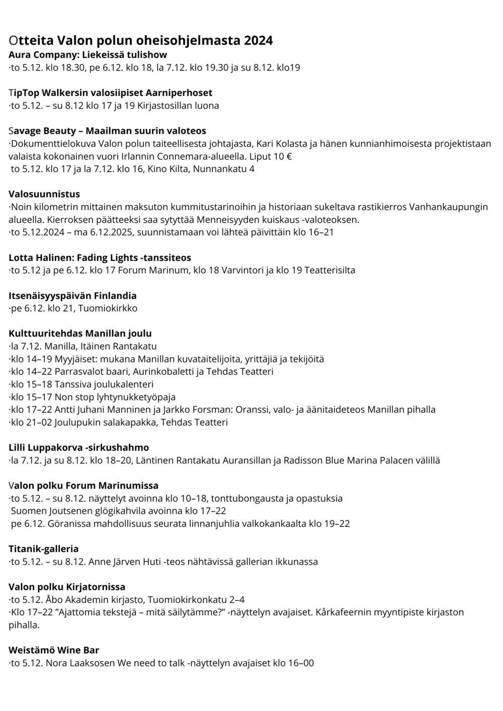 Valoteokset ja ohjelmatiedot on esitelty kootusti myös Valon polun verkkosivuilla (turku.fi/valonpolku).